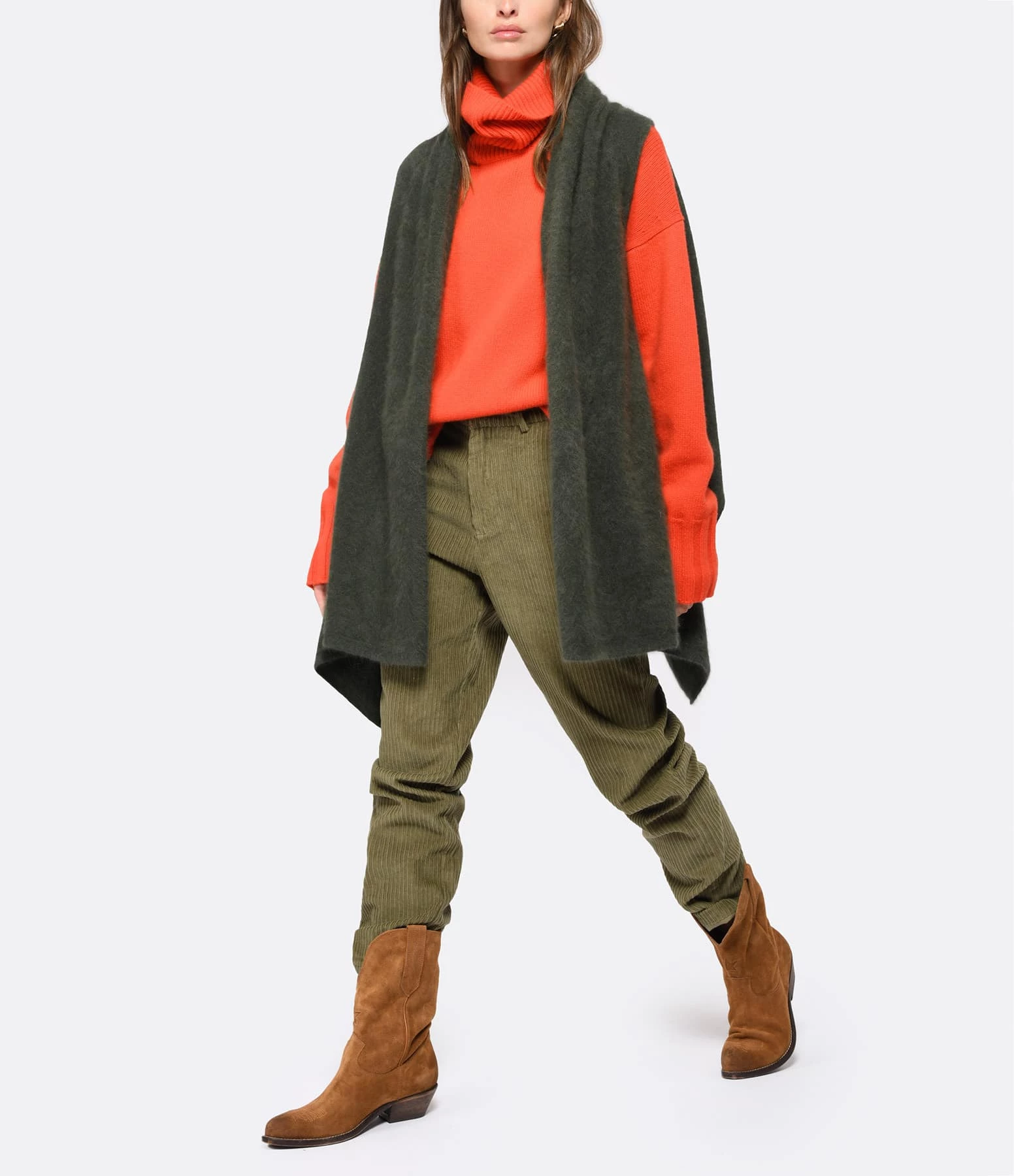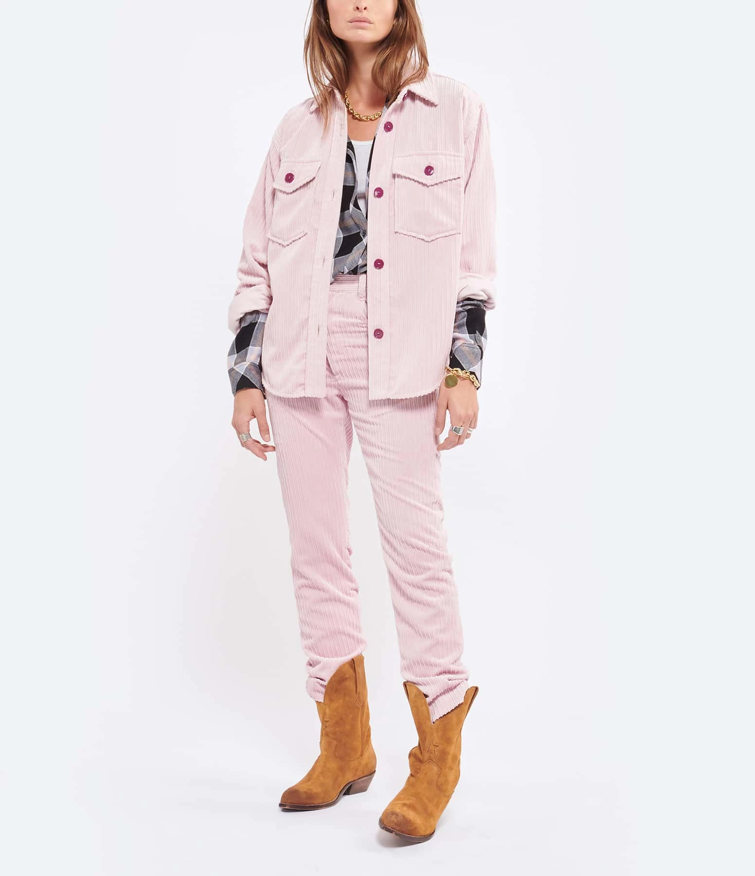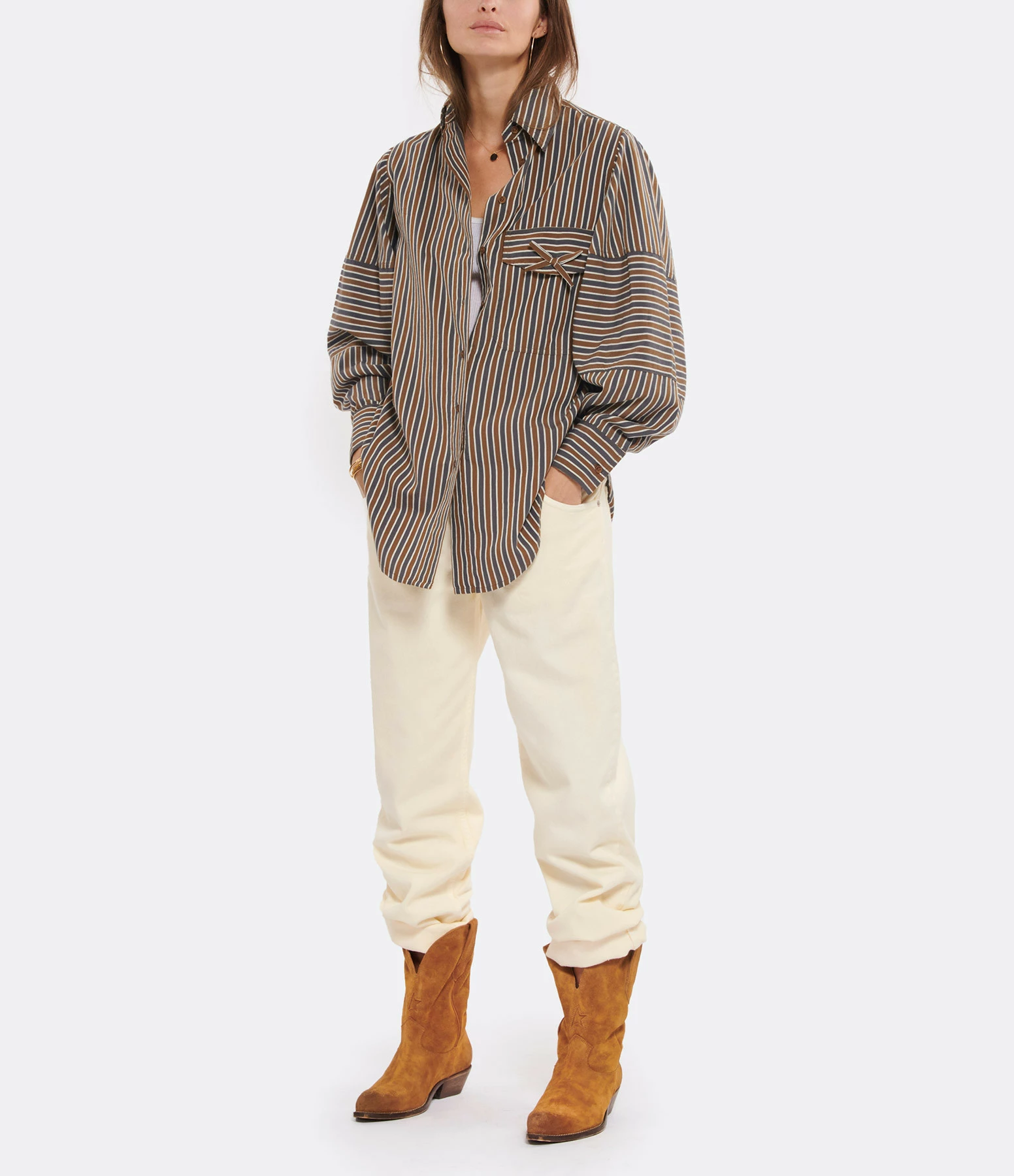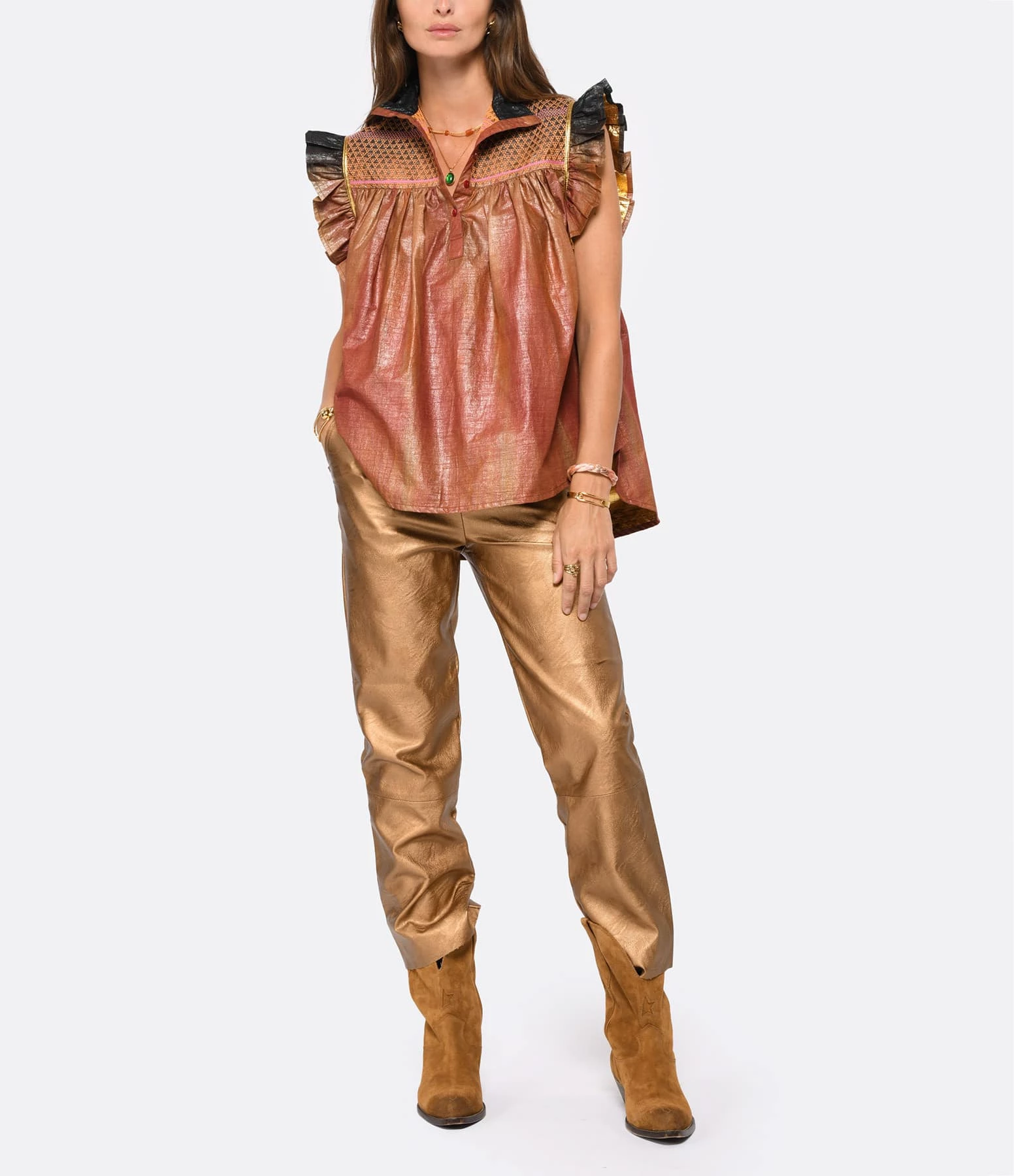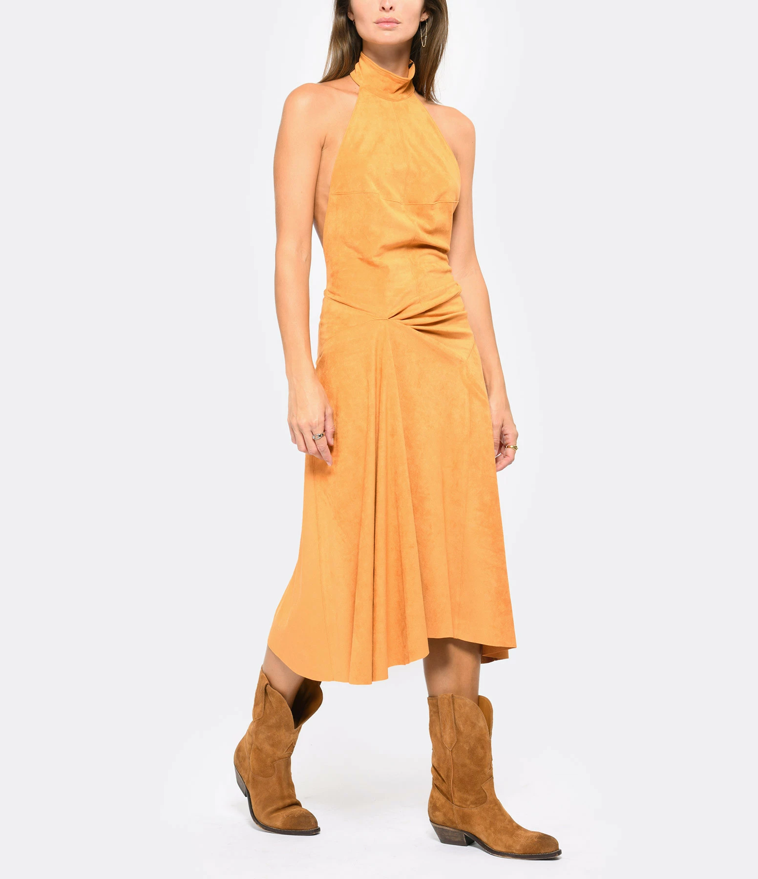 Bottes en daim couleur tabac avec broderies surpiqûres contrastantes. Patte de daim cousue sur la tige façon “cow-boy” et passepoil contrastant. Bout pointu. Intérieur doublé en cuir de vachette.