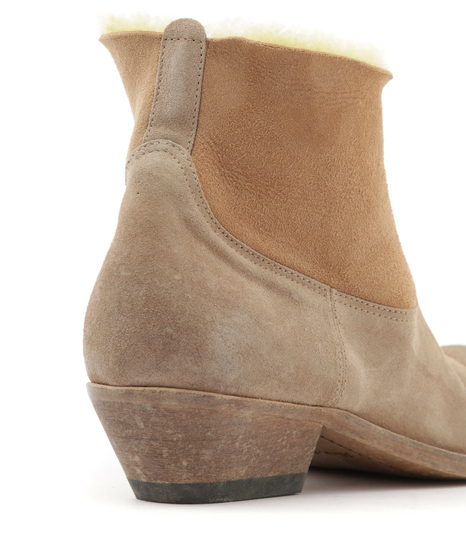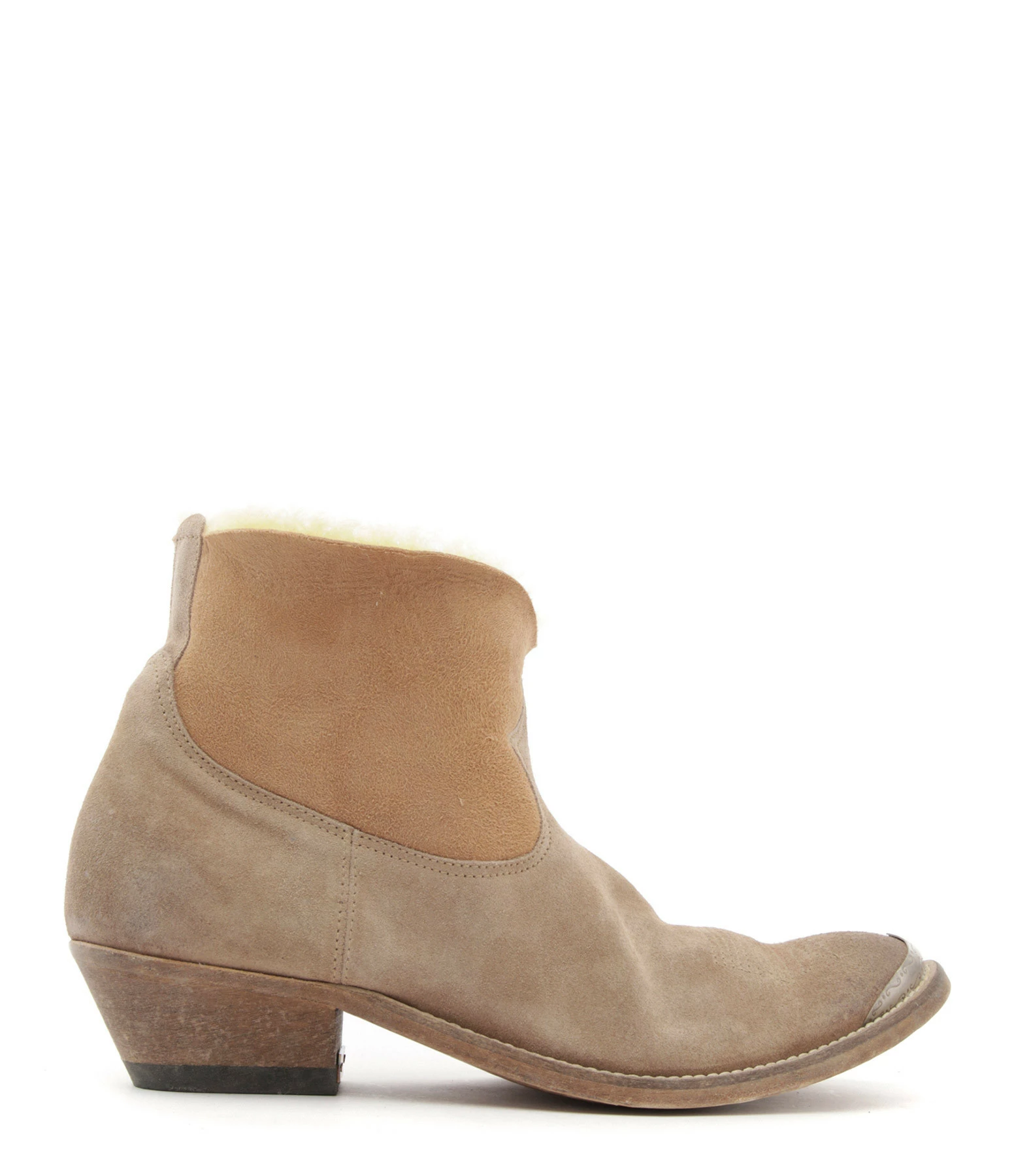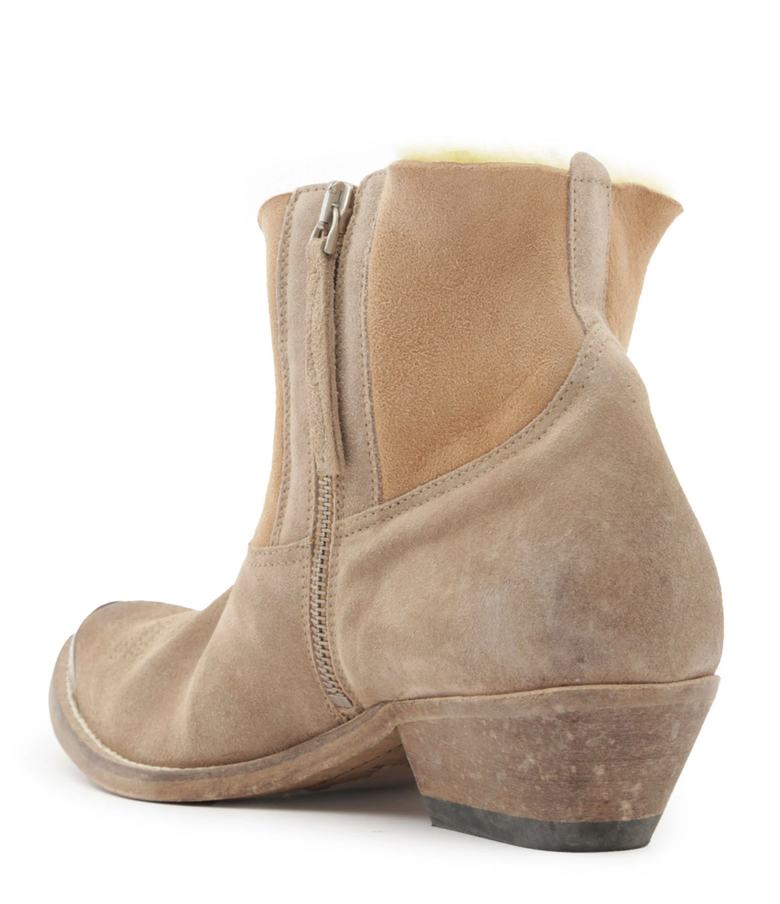 Bottines en daim couleur tabac. Bout en métal argenté effet vieilli. Doublure en shearling doux couleur crème. Fermeture éclair latérale.