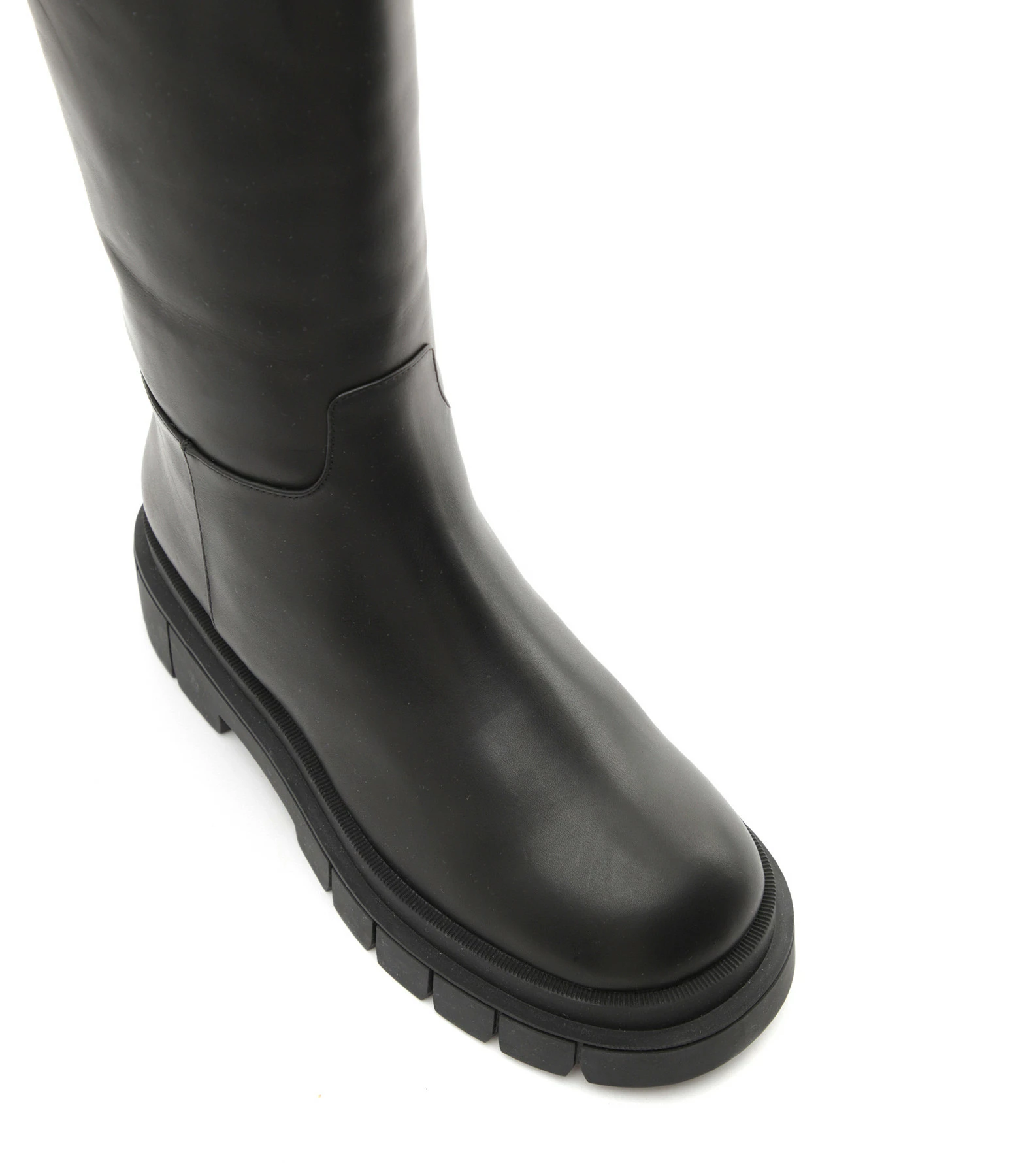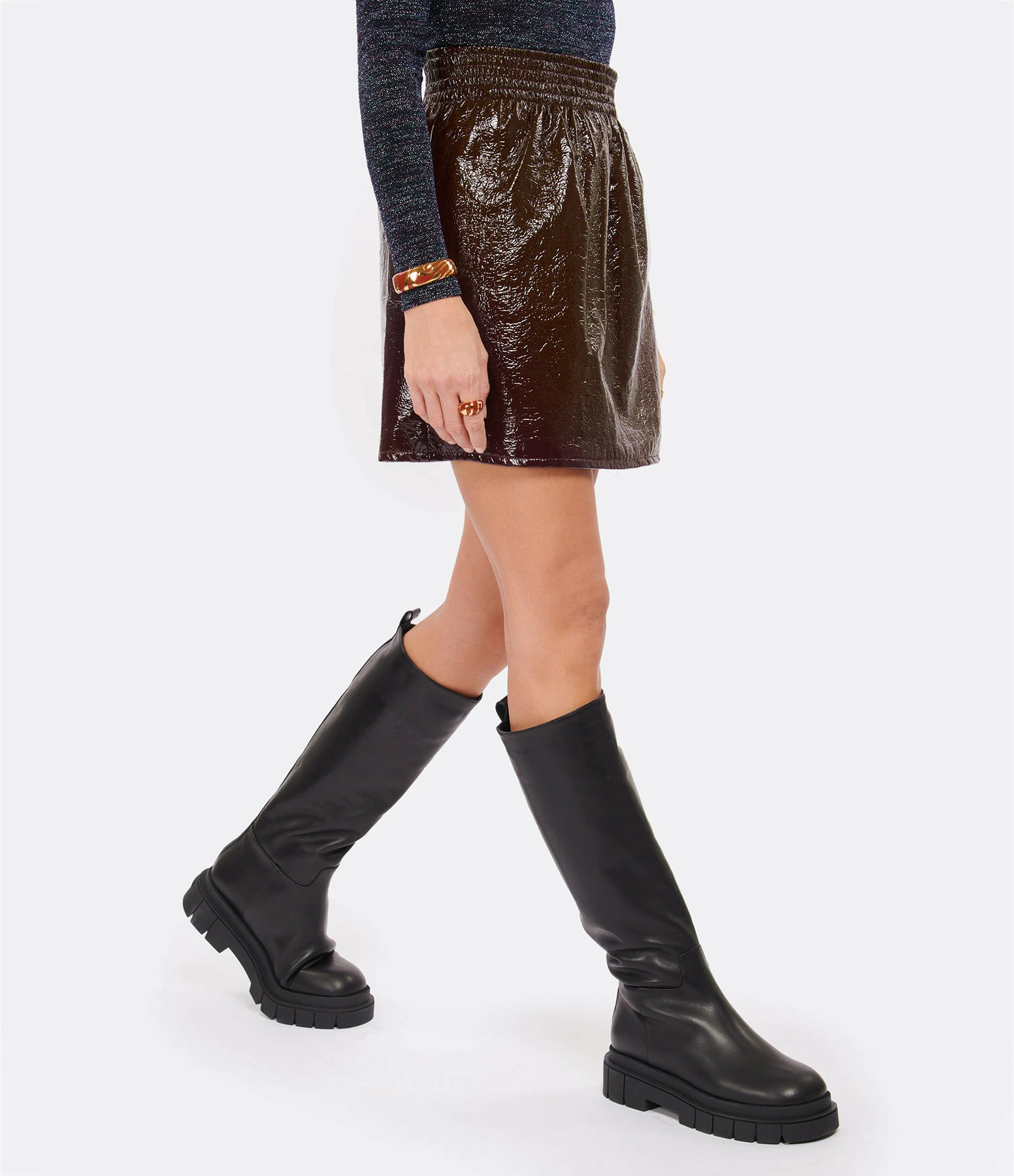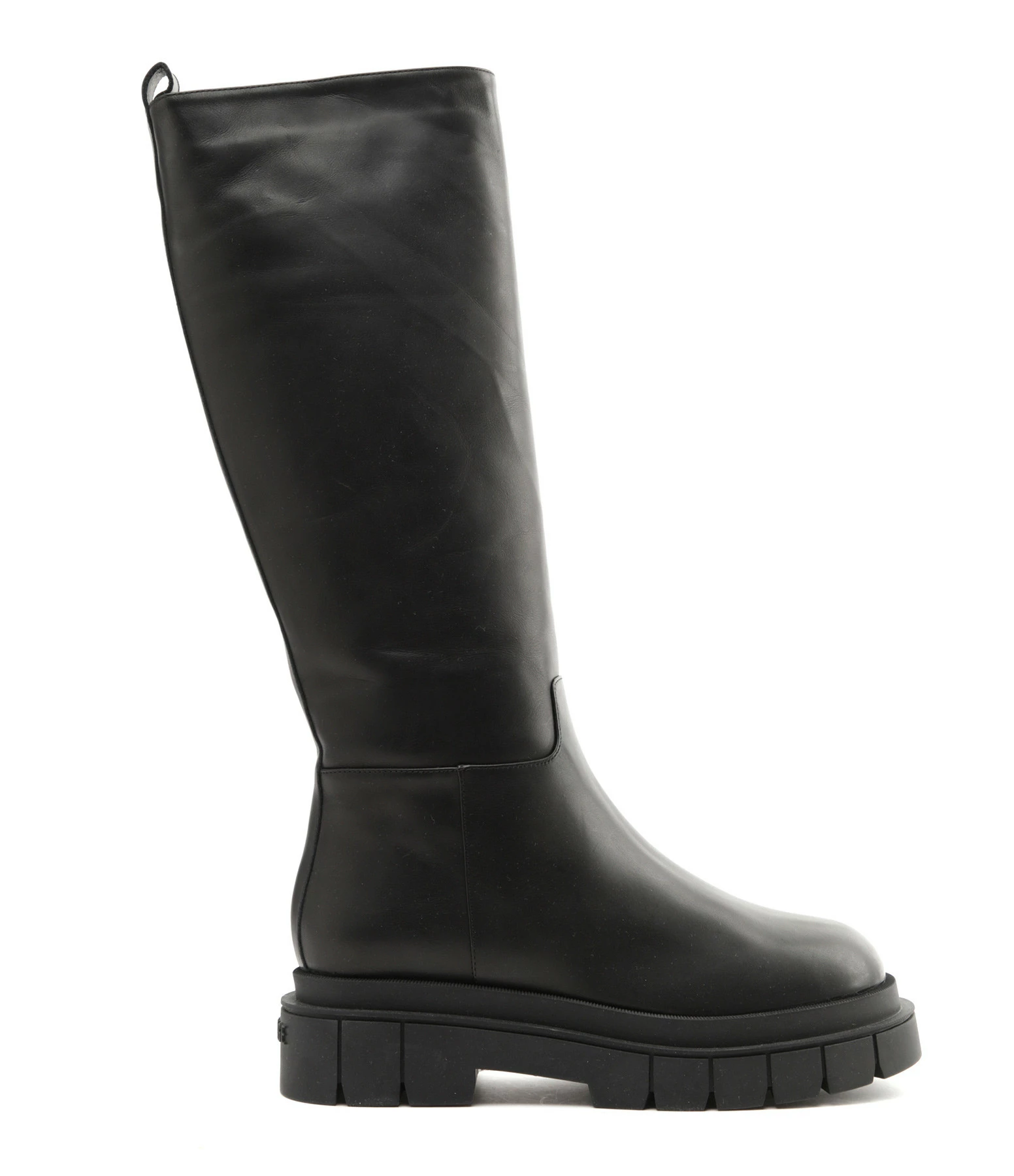 Bottes en cuir noir. Intérieur fourré. Semelle crantées épaisses en caoutchouc. Lettres contrastées sur le talon. Bout arrondi.