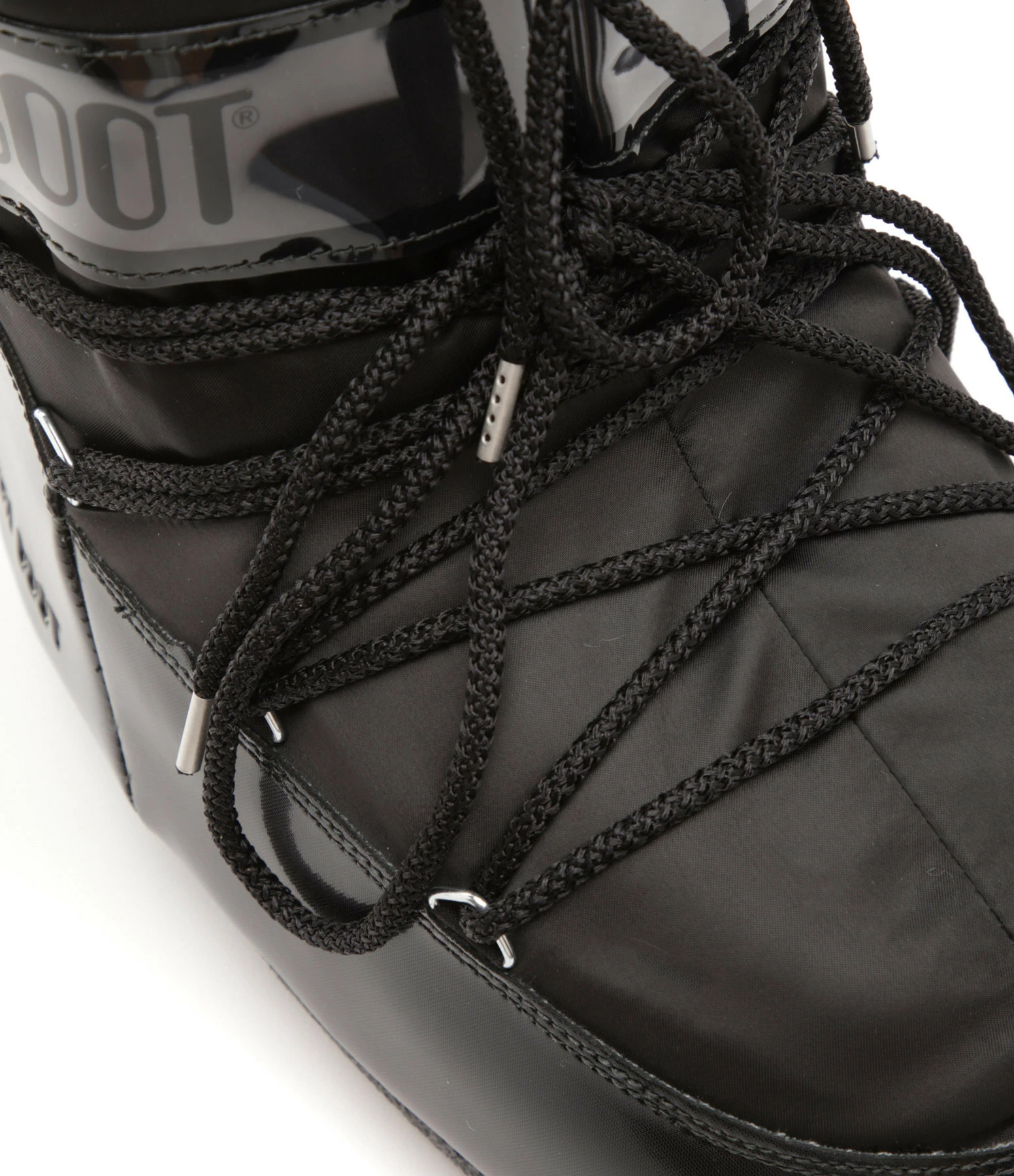Bottines basses pour femme en nylon noir. Imperméables grâce à une membrane waterproof. Élastiquées en haut de la cheville pour empêcher l’infiltration du froid et de la neige. Semelles adhérentes. Bande avec inscription “MOONBOOT” au niveau de la cheville et inscription de la marque au niveau du renfort talon. Fermeture par lacets. Doublées.