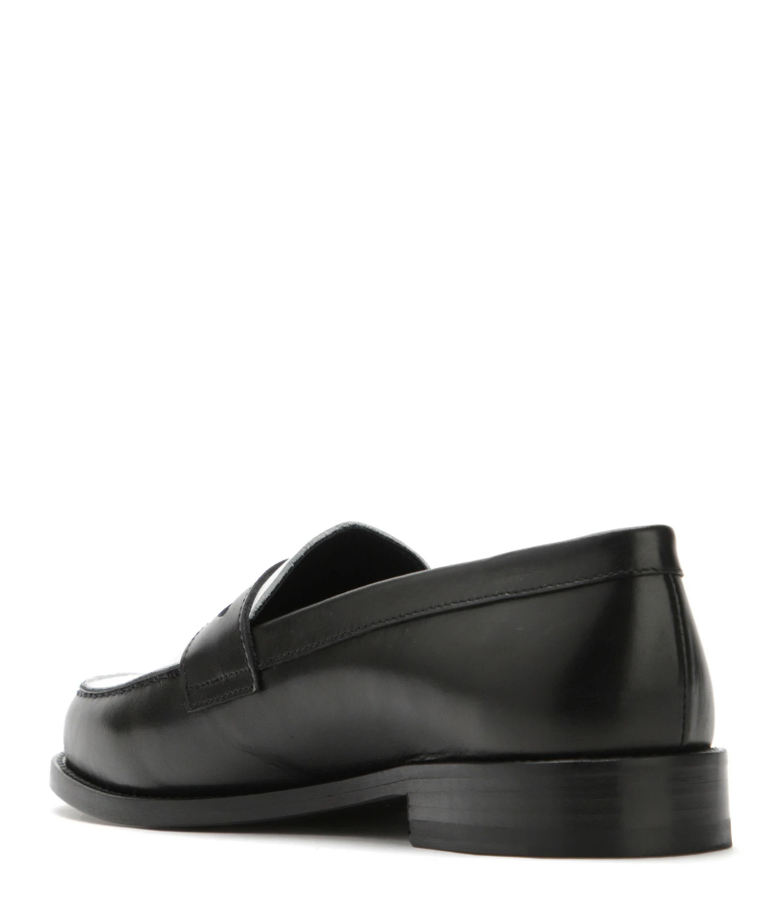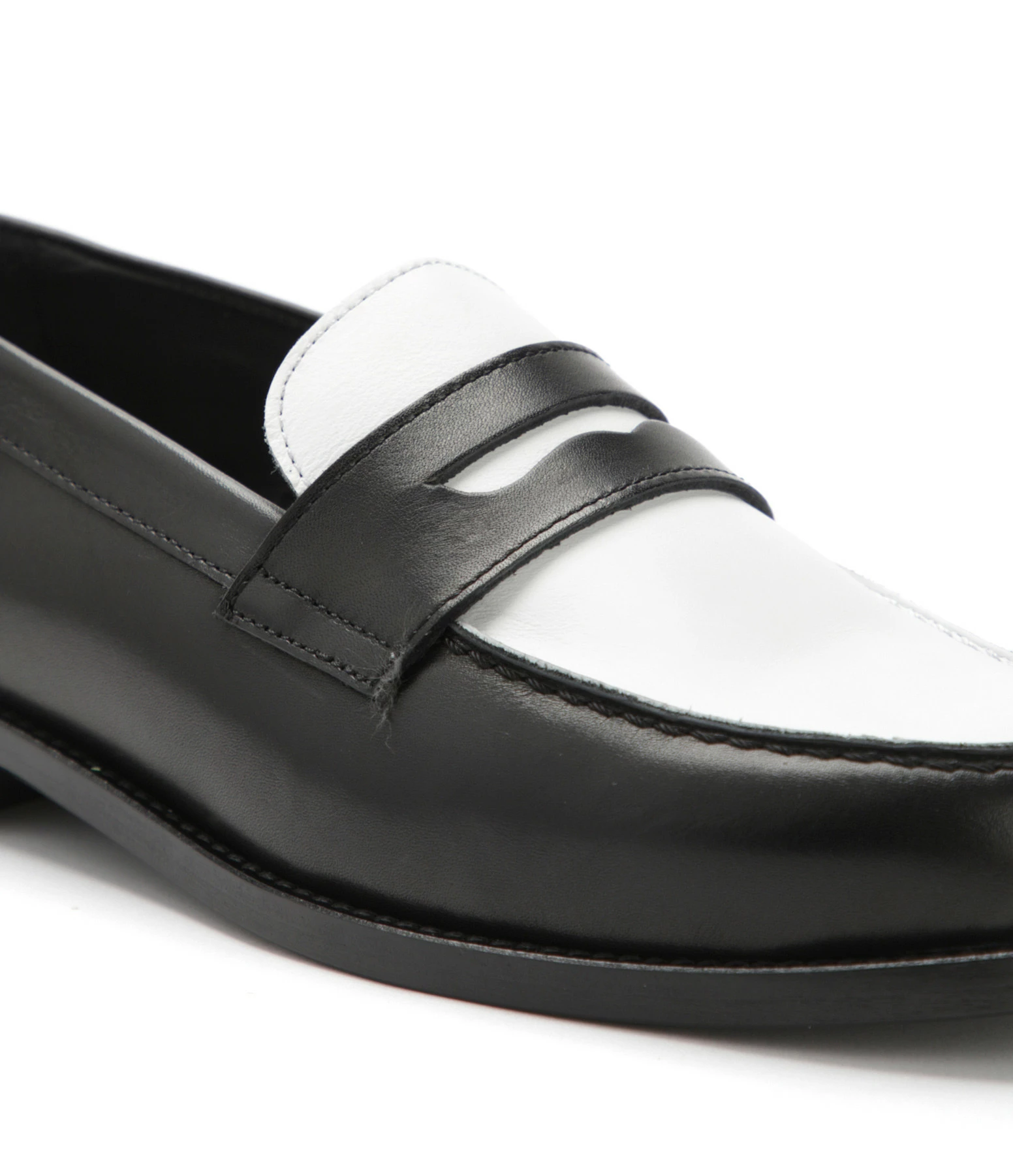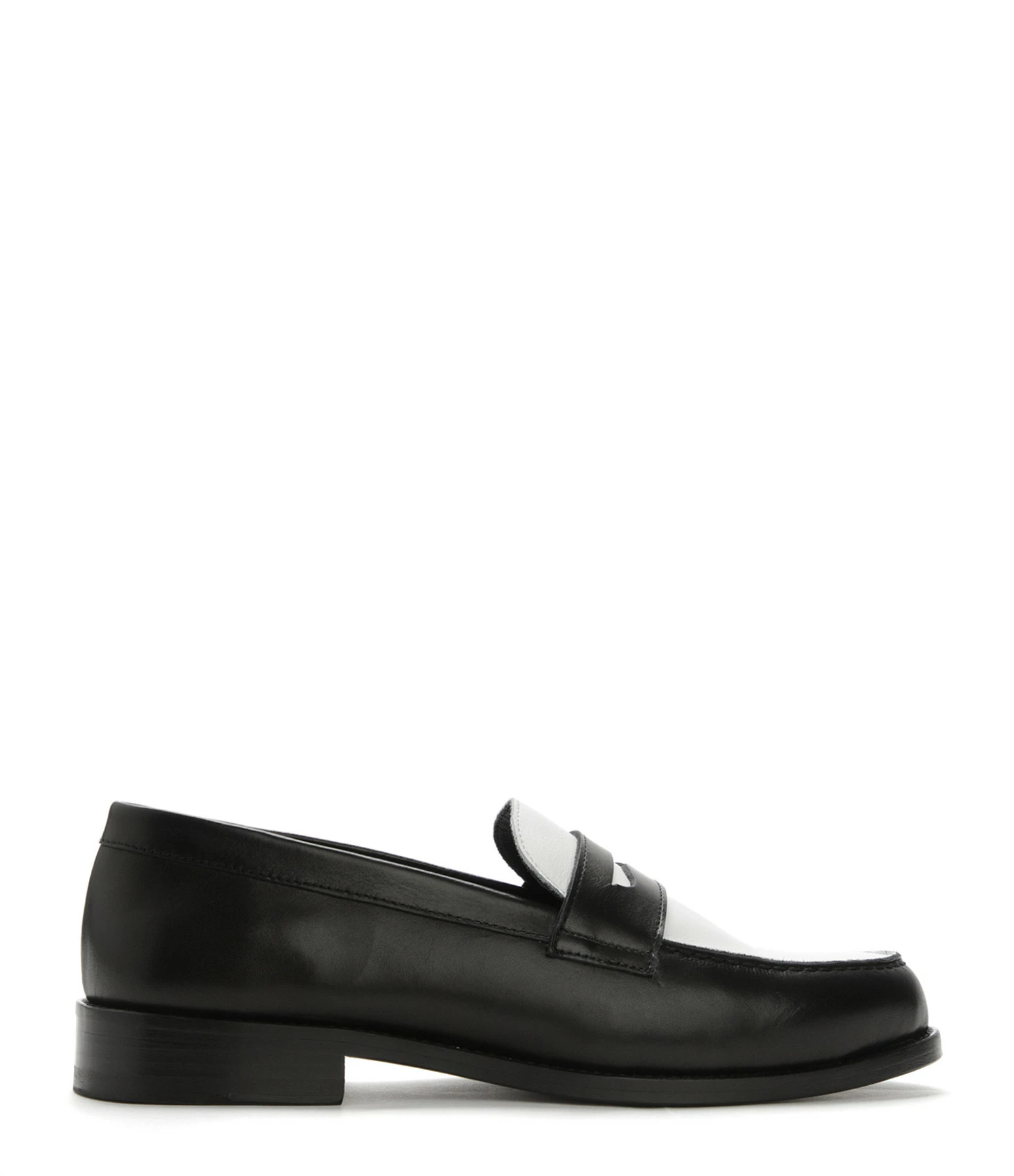 Mocassins en cuir lisse noir. Languette en cuir lisse blanc. Semelles en cuir. Talon bloc. Bout rond.