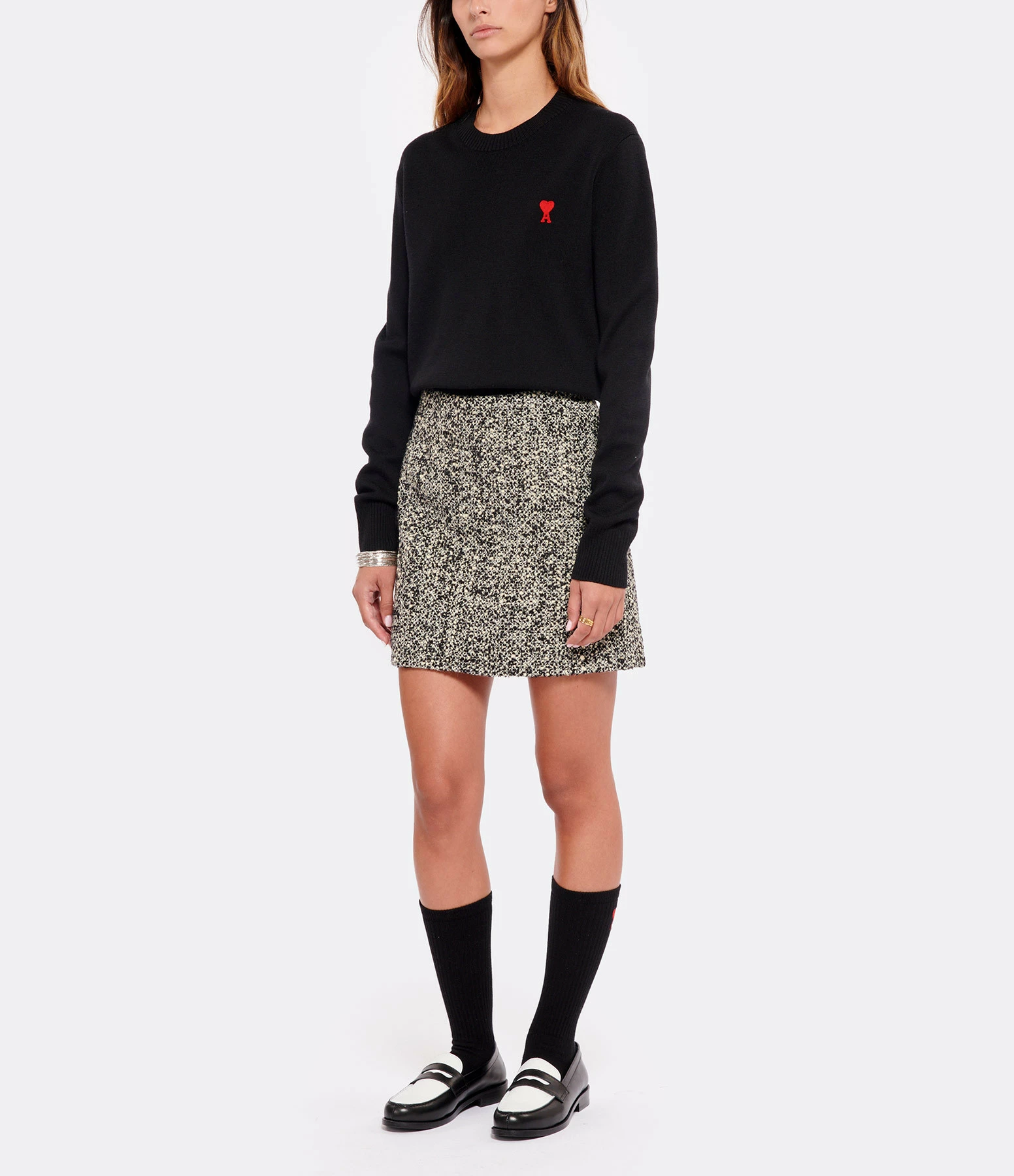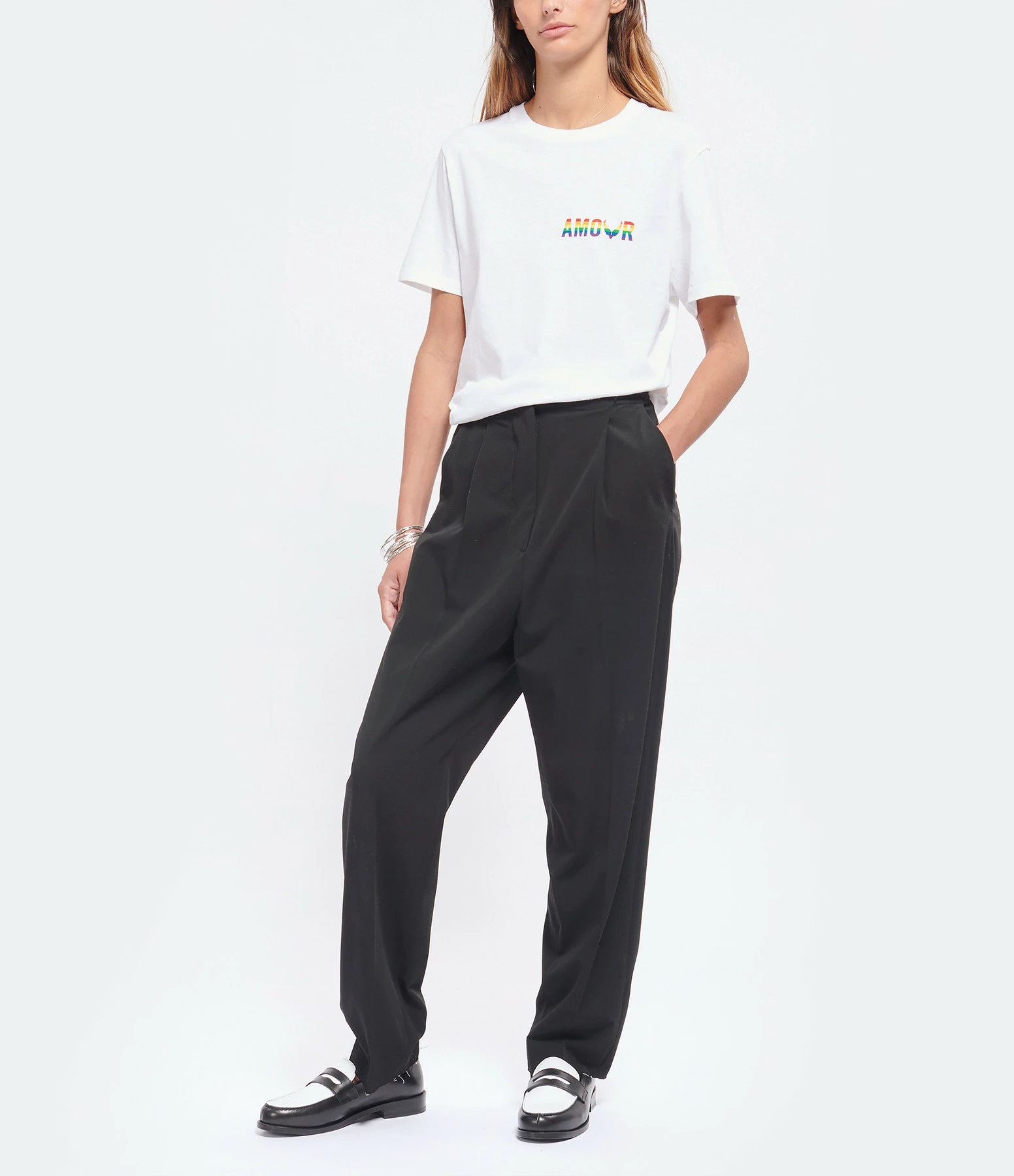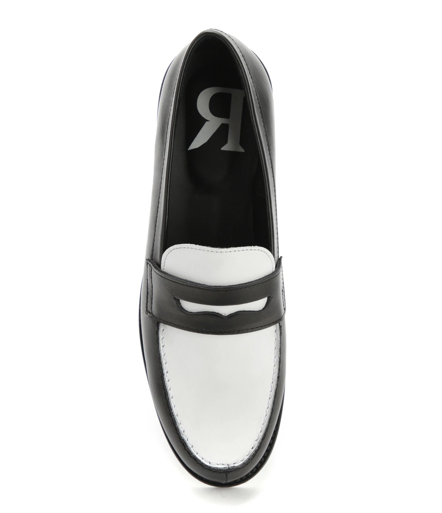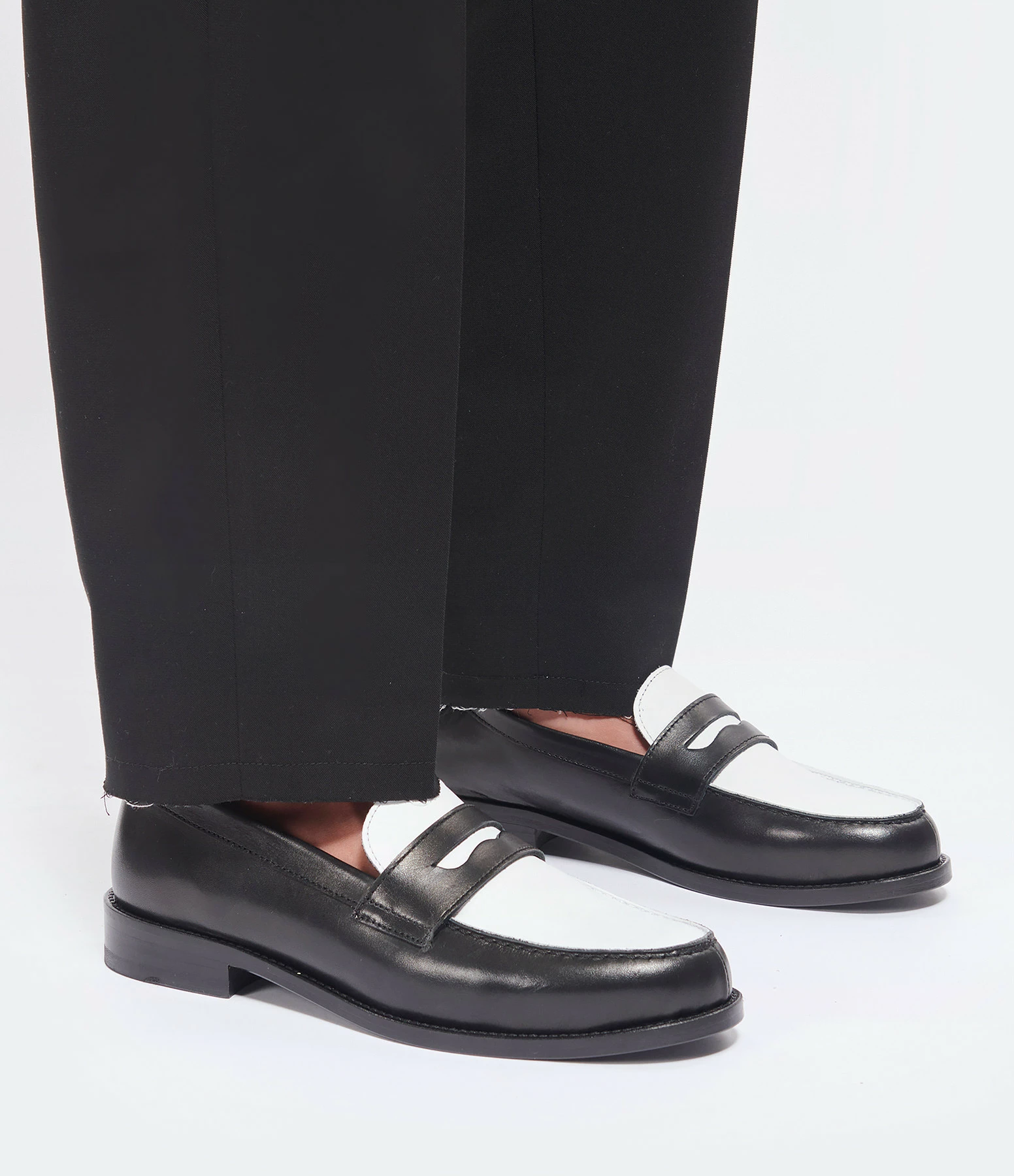 Mocassins en cuir lisse noir. Languette en cuir lisse blanc. Semelles en cuir. Talon bloc. Bout rond.
