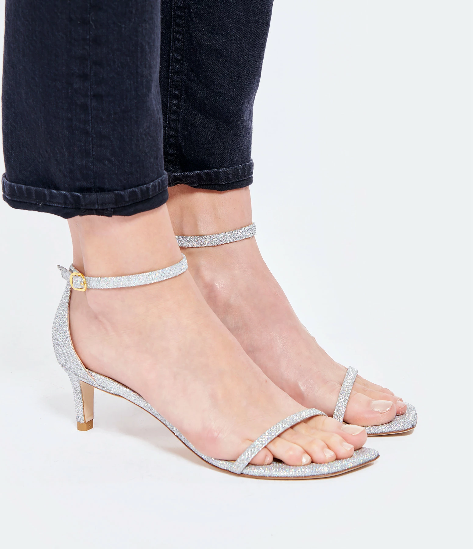 Sandales en cuir pailleté argenté. Bride à nouer à la cheville. Bout carré anguleux. Kitten heels.